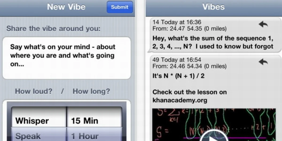 Vibe ist kostenlos und dient der Ad-hoc-Vernetzung: Der Nutzer kann selbst festlegen, wer seine Botschaft empfangen kann und wie lange. Dabei macht sich der Service den GPS-Empfänger des iPhone zunutze. So ist einstellbar, wie weit eine Botschaft, die neben Text auch ein Foto oder ein Video sein kann, empfangbar sein soll: "Flüstern" sind 50 Meter, "Sprechen" 500, "Schreien" 50 Kilometer, "Brüllen" 500 Kilometer und "Grölen" die ganze Welt.