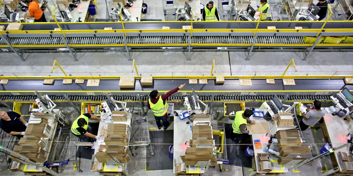 S. war im „Receive-“, also Annahmebereich, als „Production Supervisor“ tätig. Im Annahmebereich stehen die Mitarbeiter*innen an Fließbändern, schneiden hereinkommende Kartons auf, scannen die Ware und legen sie auf ein Fließband auf Kniehöhe. Der leere Karton kommt auf ein Band, das über den Köpfen entlangläuft. So geht es Paket für Paket, im Akkord.