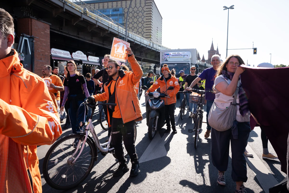Zusammen mit rund 150 Kolleg:innen und Unterstützer:innen protestiert S. gegen die Pläne Lieferandos, immer mehr bislang fest angestellte Lieferkuriere in Subunternehmen, sogenannte „Flottenpartner“, auszulagern. Dort werde systematisch gegen das Arbeitsrecht verstoßen: Keine Verträge, kein Mindestlohn, keine Sozialleistungen, kritisiert das selbstorganisierte Arbeiter:innenkollektiv Lieferando Workers Collective, das zu dem Protest aufgerufen hat.