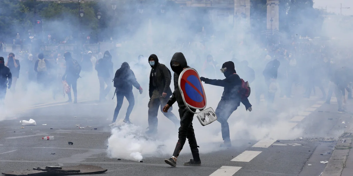 Am Rande der Kundgebung spielten sich am Nachmittag in Paris gewalttätige Szenen ab: Vermummte Demonstranten bewarfen Bereitschaftspolizisten mit Gegenständen und schlugen Schaufenster ein, die Polizei setzte Tränengas und einen Wasserwerfer ein. Die Behörden sprachen von „hunderten vermummten Personen“, die Polizisten attackiert hätten. Demonstranten hätten unter anderem Paletten von einer Baustelle entwendet und auf Polizisten geworfen.