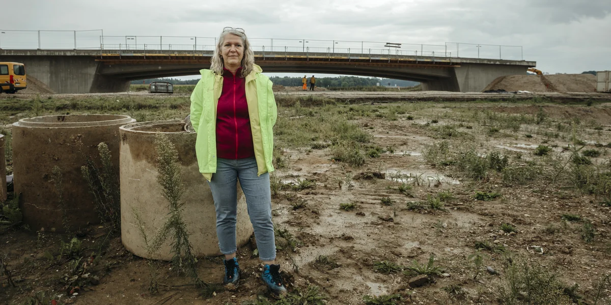 Stefanie Berg steht im strömenden Regen auf einer Baustelle, neben ihr ein aufgeweichter Kartoffelacker. Arbeiter machen sich bei diesem Wetter rar. Im Hintergrund ist eine bereits fertiggestellte Brücke zu erkennen, die einmal die Autobahn 94 zwischen Passau und München überspannen wird. Es ist diese Autobahn, die das alles wieder hochgebracht hat, die Geschichte und das KZ-Lager.
