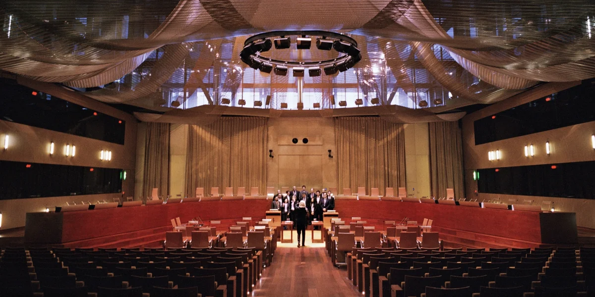 Die in rote Roben gekleideten Richter treten durch eine goldene Tür hinter dem Podium ein. Der erste Teil der Verhandlung besteht darin, dass einer der Richter die Urteilstexte in einer anderen Sprache als der, die an diesem Tag gesprochen werden soll, vorliest. Diese Texte werden weder übersetzt noch in irgendeiner Weise erläutert und sorgen so für Verwirrung. Als neuer Anwalt fragt man sich, ob man am richtigen Ort gelandet ist. Dann gehen die Richter wieder hinaus, werden noch einmal angekündigt, kommen durch dieselbe Tür wieder in den Saal und nehmen ihre Plätze ein. Die eigentliche Verhandlung beginnt.