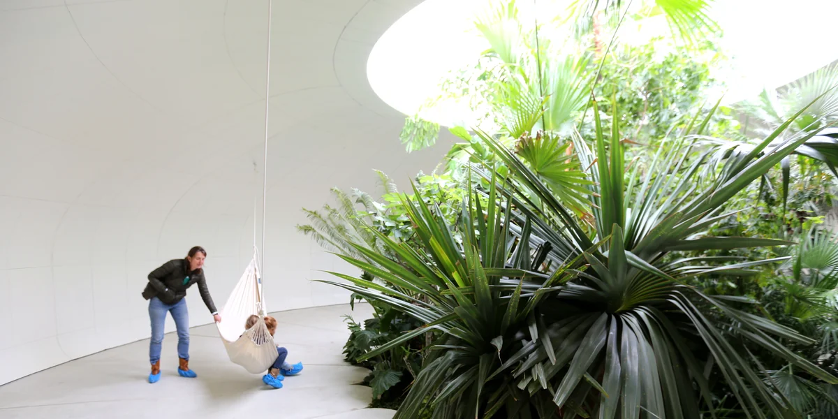 Das Resultat lässt sich jetzt bestaunen: „Yourtopia“ ist eine kuriose Mischung aus Höhle und Paradies. Wer den Grottenschlund hinter sich gelassen hat, betritt einen kreisrunden Wohlfühlraum, aus dessen Mitte Palmen und allerlei tropische Gewächse sprießen. Am Rande baumeln Hängematten von der Decke und wiegen den Besucher in süße Träume.