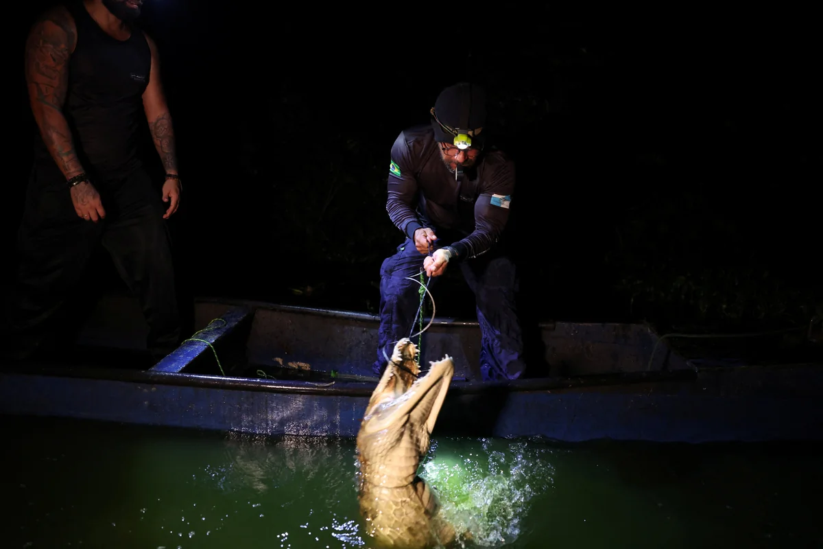 Nach einigen Minuten schwimmt ein Kaiman auf das Boot zu. Freitas hält einen angelartigen Stab in das Wasser, an dessen Ende eine Schlinge befestigt ist. Plötzlich packt er zu und zieht die Schlinge um den Hals des Tieres fest. Der Kaiman dreht und windet sich, schlägt mit dem Schwanz. „Er tanzt wie ein Bolschoi-Tänzer“, ruft Costa und lacht. Wasser spritzt in das Boot, es ruckelt gefährlich. Freitas keucht, stöhnt, Schweiß tropft ihm von der Stirn. „Alter, der ist echt groß.“