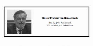 Der wegen Betrugsversuchs an der taz verurteilte Günter von Gravenreuth ist tot. Auf seiner Homepage wurde eine entsprechende Nachricht veröffentlicht.