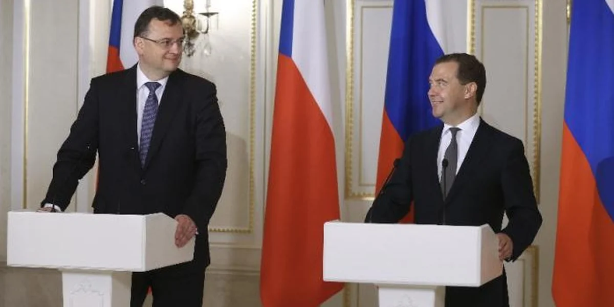 Schleimen in Moskau: Tschechiens Premier Petr Necas (l.) zu Besuch bei seinem russischen Amtskollegen Dmitri Medwedjew. Bild: reuters