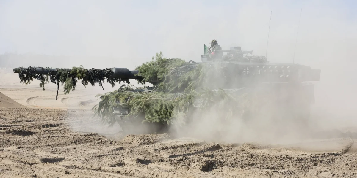 Wirbelt ordentlich Dreck auf: Kampfpanzer Leopard 2 bei einer Bundeswehrübung in der Oberlausitz Foto: Christian Thiel/imago