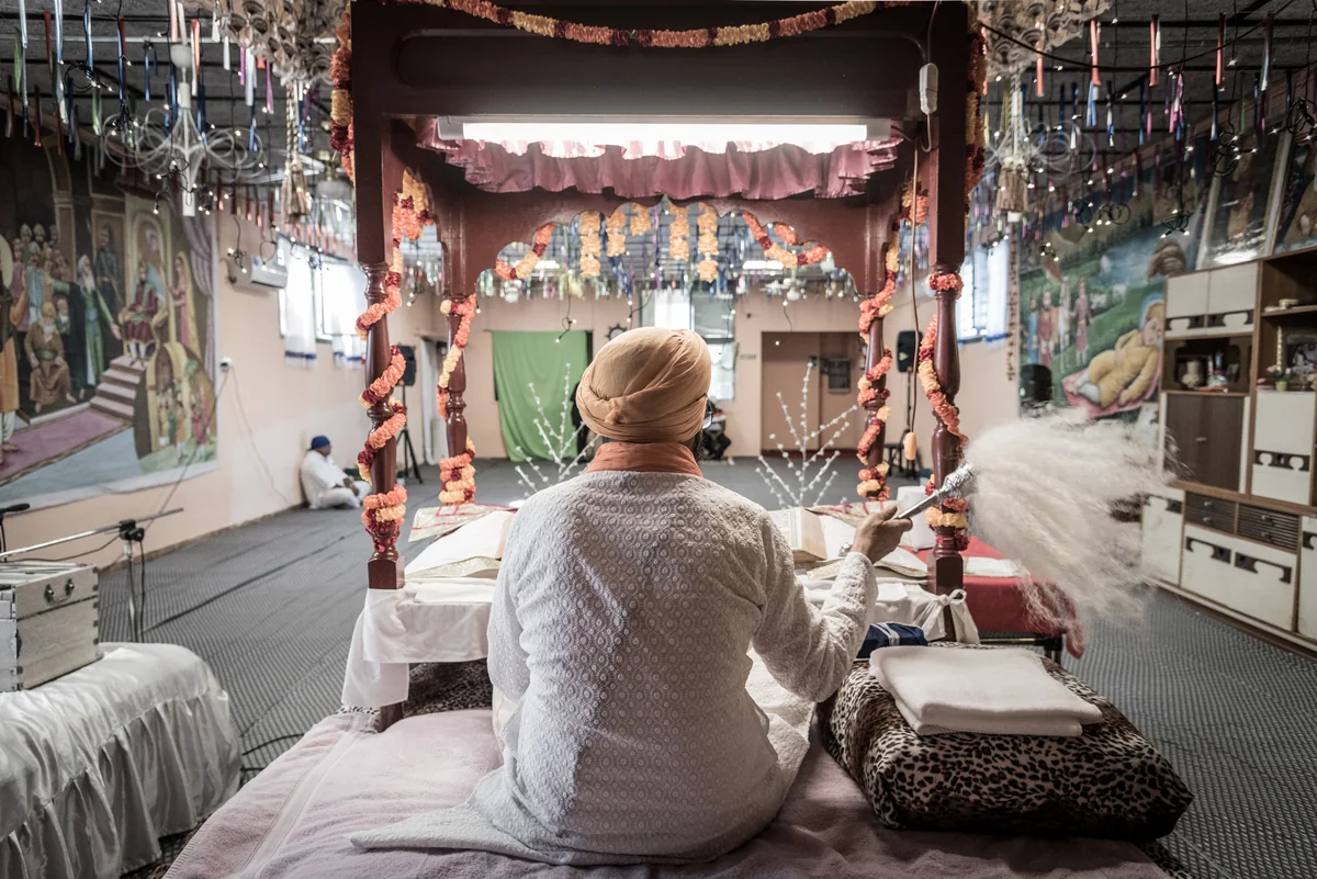 In den Sikh-Tempeln in den Städten Velletri, Cisterna und Pontinia trifft sich die indische Gemeinde sonntags. Das Wort „Schulden“ wird bei unseren Gesprächen, obwohl es sehr viele hier betrifft, nur verschämt geflüstert. Viele Tempel wurden in alten Lagerhallen eingerichtet, die später renoviert und zu Gotteshäusern umfunktioniert wurden. Der Tempel in Velletri zum Beispiel besteht aus einem einzigen großen Raum mit rosafarbenen Wänden, einem mit Teppichen bedeckten Boden und buntem Papier, das an der Decke hängt. Der Altar im hinteren Teil des Raumes ähnelt einem Himmelbett. Von dort aus liest der Gottesdiener – der Granthi – aus dem heiligen Buch.