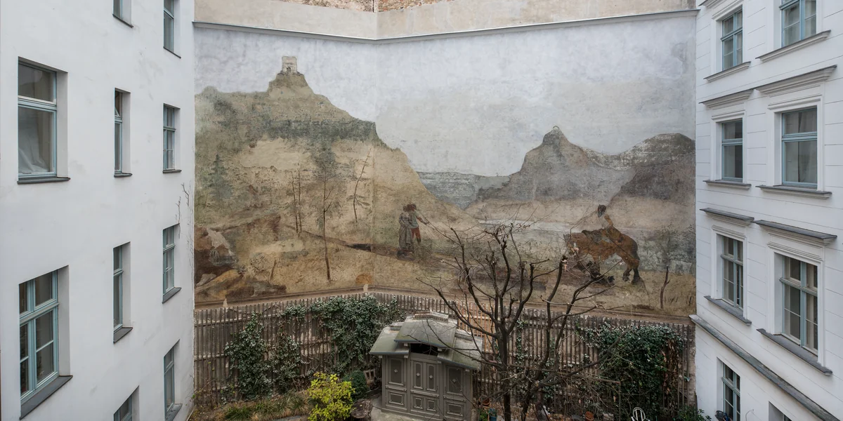 Nele Wasmuth: In unserem Hinterhof befindet sich ein großes Landschaftsbild, das sich über die gesamte Brandmauer des Nachbarhauses erstreckt, auf dem Berge, ein See und mehrere Menschengruppen zu erkennen sind: Menschen an einem Tisch, ein junger Reiter, ein Paar. Es ist nicht hundertprozentig sicher, was dieses Wandbild darstellt, aber es wird vermutet, dass es sich um Szenen aus Mozarts Oper „Don Giovanni“ handelt. Wenn man in den Hof kommt, hat man den Eindruck, man betritt ein Märchen. Die Malerei ist entstanden, als das Haus gebaut wurde, ungefähr im Jahr 1890. Sie war stark verwittert, wurde noch nie überarbeitet. So weit ich weiß, existieren aus dem ausgehenden 19. Jahrhundert nur noch zehn große Innenhof-Wandbilder dieser Art in Berlin. Viele sind in den letzten Jahren wegen der Wärmedämmungen verschwunden.