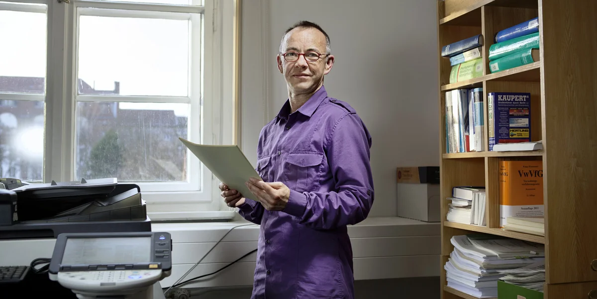 Genau, Anja Weber hat erstaunlich nüchterne Aufnahmen gemacht, gerade so, als wolle sie zeigen, wie banal es sein kann, trans* im Job zu sein. Sie selbst stehen zwischen Büchern und Akten in einem kargen Büro. Wie finden Sie diesen Ansatz?