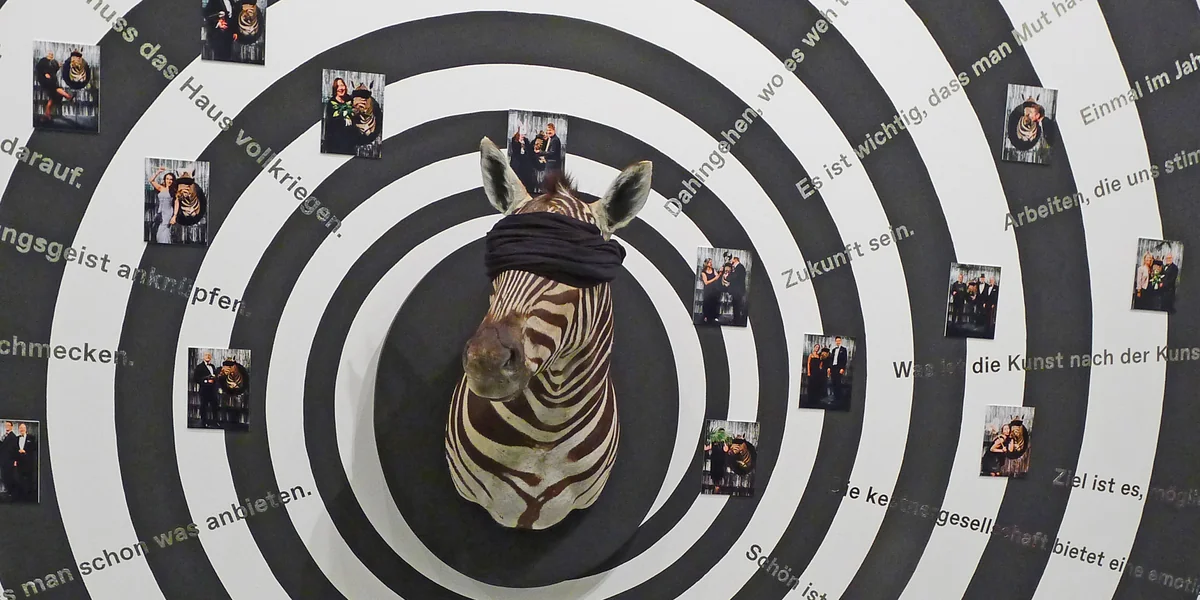 Müller legte ihr eine Augenbinde an und erhob sie so zur skurrilen Justitia. So richtet sie nun über Spezifik, Bedeutung oder Resonanz dieser Kunstinstitution, die von ihren rund 4.000 Mitgliedern getragen wird. Mehr oder weniger prominente unter ihnen gaben knappe Einschätzungen der Kestnergesellschaft zu Protokoll, Müller hat sie zu einer psychedelischen Spiralgrafik in schwarz-weiß-silber rund um das Zebrahaupt versammelt. Besucher dürfen mit Klebepunkten noch ihre Vorliebe für die eine oder andere Sentenz kenntlich machen.