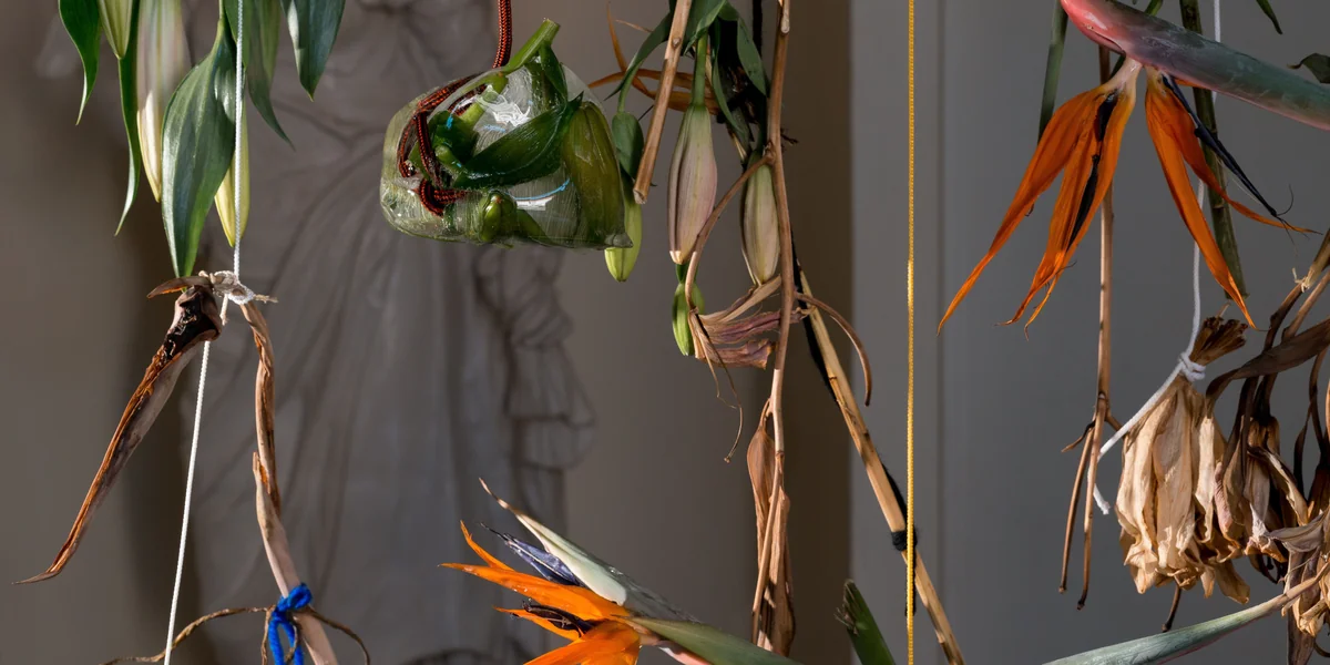 In der Eingangsrotunde der Villa antwortet der Italiener Luca Trevisani mit einem eigenen Hinweis aufs Vergehen alles Lebendigen: Hängende Sträuße exotischer Blumen und Pflanzen zeigen da unterschiedliche Stadien des Verfalls. Einige Blüten wurden in Eisbeutel eingefroren, verloren dabei gänzlich ihre Farbe und tropfen nun theatralisch.