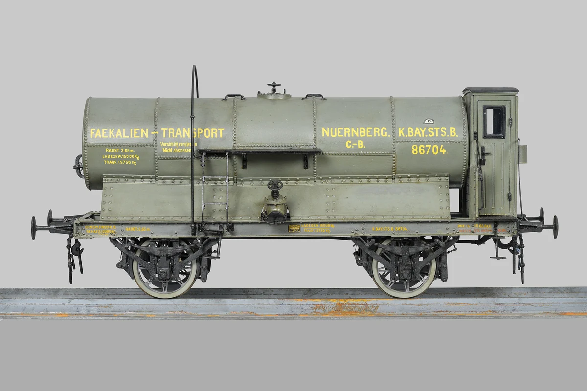 Ein anderes Modell zeigt einen Packwagen der Königlich Bayerischen Staatsbahnen mit eingebautem Klo. Da musste der Reisende bei einem Unterwegsaufenthalt rasch sein Abteil und den Zug verlassen und zum Gepäckwagen eilen in der Hoffnung, dass dieser nicht schon besetzt war. Und nach Verrichtung der Notdurft musste er bis zum nächsten Halt dort verweilen.