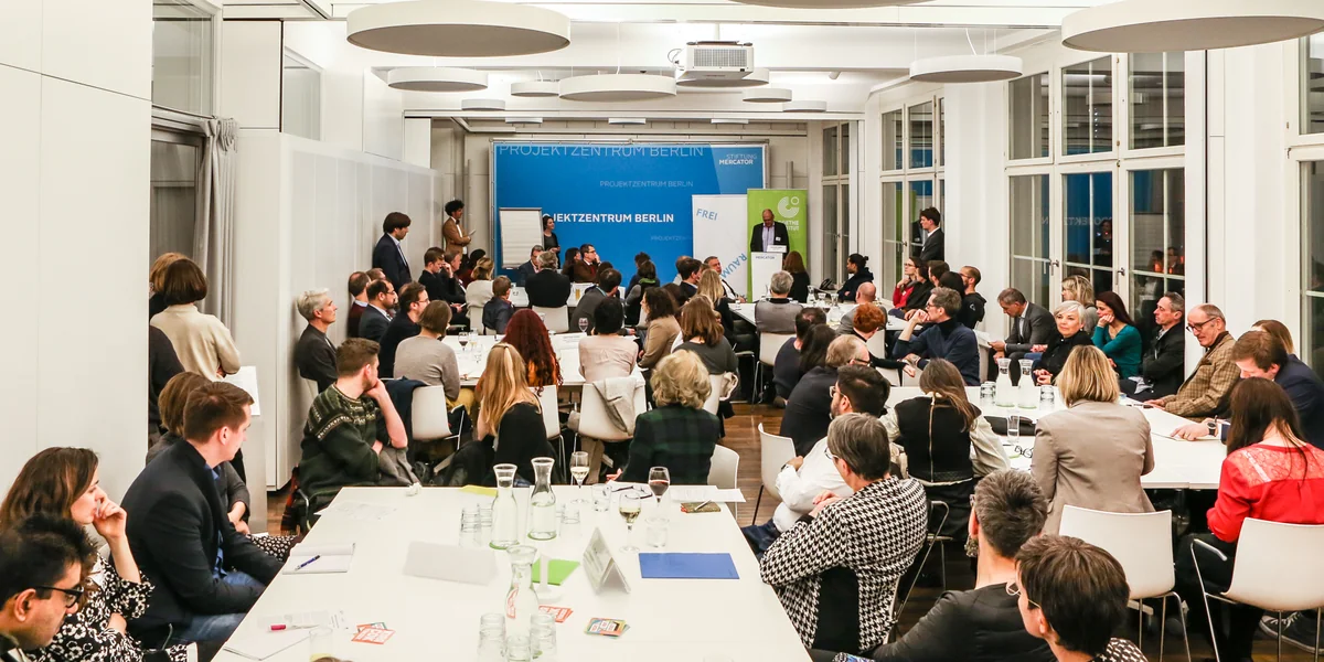 Doch das von der Stiftung Mercator entwickelte Gesprächsformat ist gewöhnungsbedürftig. Fünf Gruppen sitzen an fünf nach Thema geordneten Tischen in einem großen Saal, es ist sehr laut und, Eberts Ansprache zum Trotz, oft schwer, sich gegenseitig zu verstehen. Zu Beginn der Diskussionen halten Expert*innen einen kurzen Vortrag zum Thema, auf vier Frauen kommen dabei elf männliche Experten. Die jeweils 50 Minuten Diskussionszeit vergehen sehr schnell. „Ich könnte noch stundenlang weiter diskutierten“, beschwert sich Sandy Kaltenborn von der Initiative Kotti &Co zwischendurch. Trotzdem ist es spannend zu sehen, mit welchen alltäglichen Problemen die Menschen in anderen europäischen Ländern zu kämpfen haben und welche Ideen sie mitbringen.