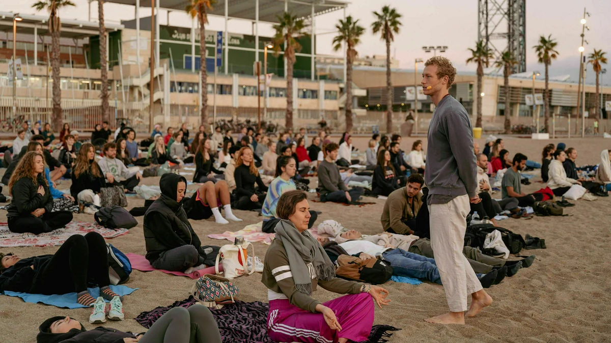 Während langsam die Sonne aufgeht, sitzen im Sand einhundert Menschen und starten in eine geführte Meditation. „Lebe in der Gegenwart, das ist dein ganz persönlicher Moment“, sagt jemand auf Englisch. Die Teilnehmenden hören die Stimme des Coaches durch Bluetooth-Kopfhörer. Nach der Einheit umarmen sich die Mitglieder der Gruppe und springen ins Meer. „Wie könnte man den Tag besser beginnen“, sagt eine Französin zu ihrer Freundin aus Seattle, bevor sie in die Wellen eintaucht, „und das ist in Barcelona ein ganz normaler Mittwoch.“