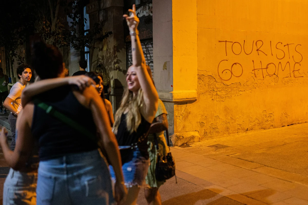 Das Graffito auf der anderen Straßenseite fällt auch der Gruppe auf. „Vor zwei Jahren kam mir die Stadt noch gastfreundlicher vor“, sagt jemand. „Ich habe auch das Gefühl, dass ich mich vor Einheimischen viel öfter dafür rechtfertigen muss, dass ich in Barcelona lebe“, stimmt eine zweite Person zu. Alle bemerken die zunehmenden Spannungen in der Stadt. Dabei bleibt es nicht nur bei Schriftzügen auf den Straßen.