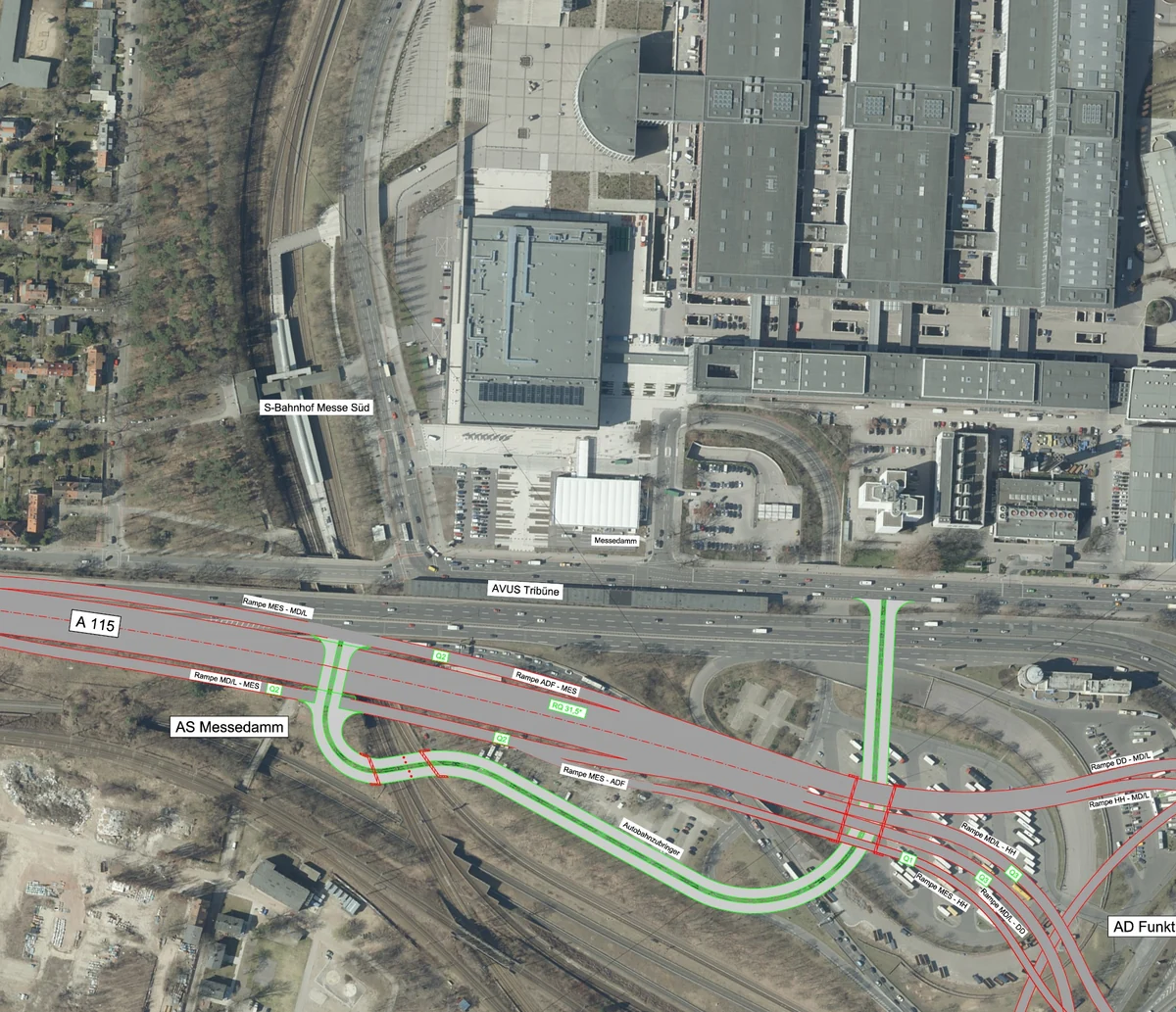 Aber sie erfüllt die wichtigsten Anforderungen: Die Anschlussstelle bindet die Avus nicht mehr an die Jafféstraße, sondern an den Messedamm an und rückt mehrere hundert Meter von der Wohnsiedlung ab, die Hochlegung entfällt. Dafür muss sich die Zufahrt in einer ziemlich wilden Konstruktion über eine Bahnlinie sowie unter der Autobahn durchschlängeln. Anders hätte der Platz nicht gereicht.