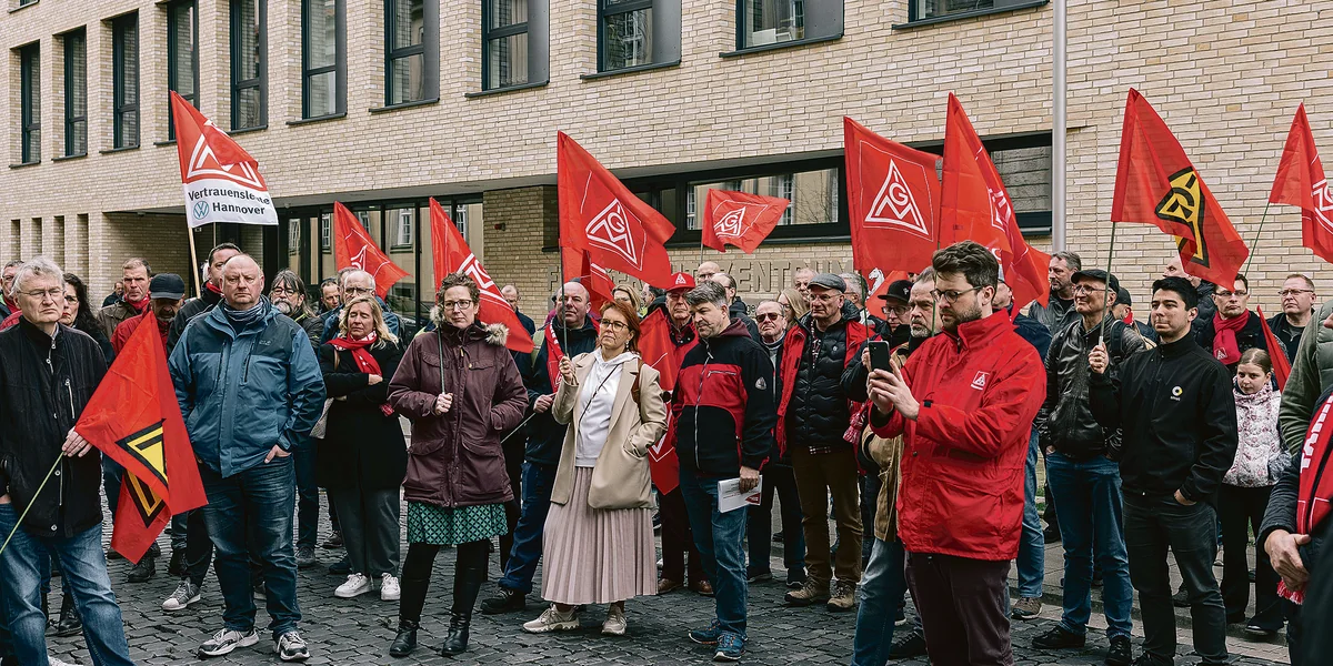 Vor dem Arbeitsgericht Hannover wehen am Dienstagmittag rote Fahnen der IG Metall. Rund 100 Gewerkschafter*innen sind gekommen, um ihre Solidarität mit einem gekündigten Betriebsratsvorsitzenden auszudrücken. Der Autohändler „Nord-Ostsee Automobile“ hatte den Betriebsratsvorsitzenden Florian P. von seiner Arbeit freigestellt, ihm Hausverbot erteilt und die Betriebsratsarbeit untersagt.