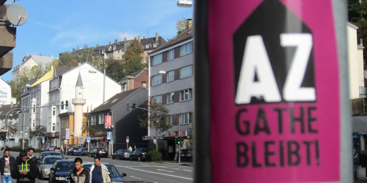 Die sechsspurige Einfallstraße Gathe im Stadtteil Elberfeld trennt die Moscheegemeinde vom Autonomen Zentrum (AZ). Das Gotteshaus mit seinem zur Straße hin offenen Innenhof fügt sich zurückhaltend in das Quartier, selbst das vor einigen Jahren neu gebaute Minarett reicht nicht über die Brandmauer des Nachbarhauses hinaus. Auch das AZ zeigt sich nach außen hin angepasst. Unauffällig, drei Stockwerke, verschnörkelter Fries in Weiß und Gelb, an der Fassade die Reste linker Plakate.
