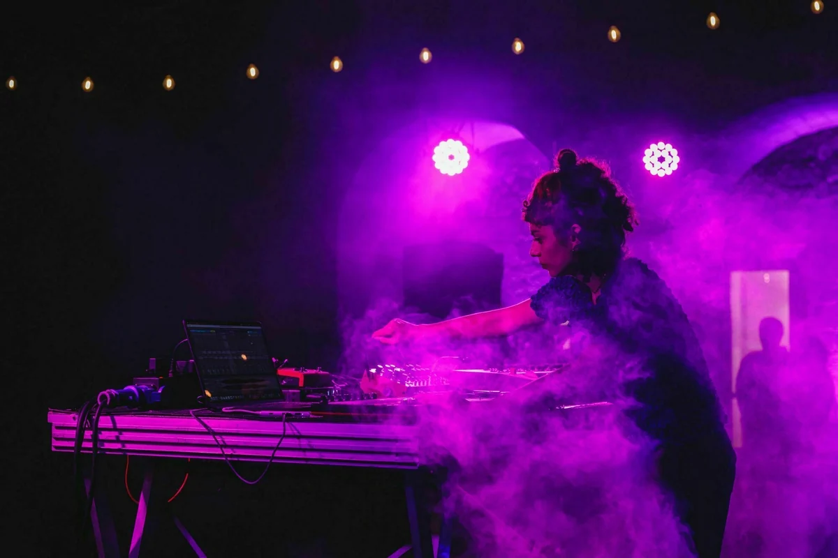 Es folgt etwa ein tolles, dynamisches Set der in Wien lebenden Klangkünstlerin Rojin Sharafi. In ihre abwechslungsreiche, mäandernde Soundcollage fließen Dabke-Rhythmen ein. Der traditionelle palästinensische Reihentanz wurde 2023 in die Unesco-Liste der immateriellen Kulturgüter aufgenommen. Sharafi zeigt, dass man sich der komplexen Situation im Nahen Osten durchaus künstlerisch nähern kann, statt ständig unterkomplexe Parolen zu wiederholen, die in progressiv orientierten Musikkreisen allzu oft für Verwerfungen sorgen.