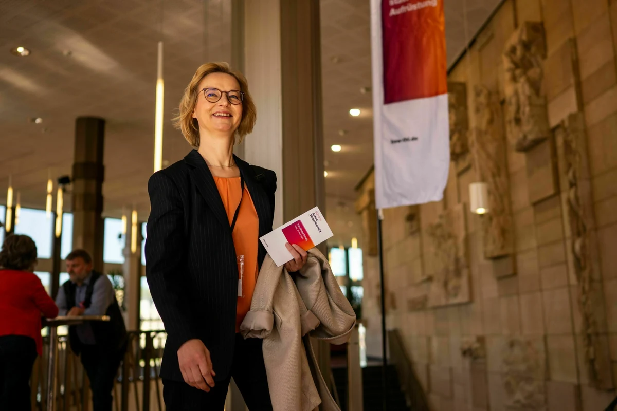 Mit einem leichten Lächeln lehnt Katja Wolf an einem Tresen in Geras Kultur- und Kongresszentrum. Aus dem großen Saal neben ihr dringt Stimmengewirr. Der Thüringer Landesparteitag des Bündnisses Sahra Wagenknecht (BSW) ist an diesem Samstagnachmittag noch in vollem Gange. Aber die spannendste Wahl ist schon erledigt: Katja Wolf gegen die von der Bundesvorsitzenden Sahra Wagenknecht unterstützte Anke Wirsing. Wirsing bekam 35 Stimmen, Wolf gewann mit 61 Stimmen.