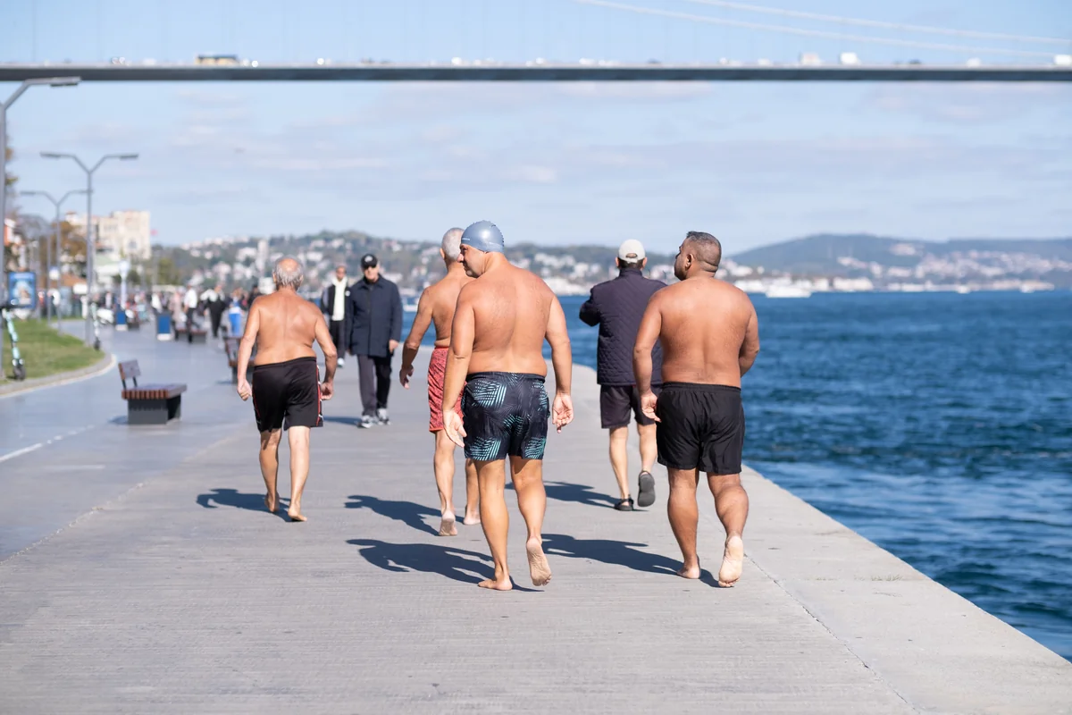 Samstagmorgens flanieren vor allem Leute mittleren Alters mit teuren Laufschuhen auf der Promenade. Auch İnanç Kesinoğlu kommt auf seinem täglichen Spazierweg hier vorbei. An diesem Oktobertag trägt der 49-Jährige eine Jogginghose und Sportschuhe, ein Langarmshirt, eine Weste und eine Cap auf der Glatze. Doch Kesinoğlu, der dank eines Wahlgeschenks der AKP bereits in Rente ist, läuft die Promenade nicht nur entlang – manchmal springt er auch von ihr ins Wasser. Direkt zwischen den großen Fähren und dem kleinen Anleger für den öffentlichen Nahverkehr, der von der europäischen zur asiatischen Seite der Stadt pendelt.
