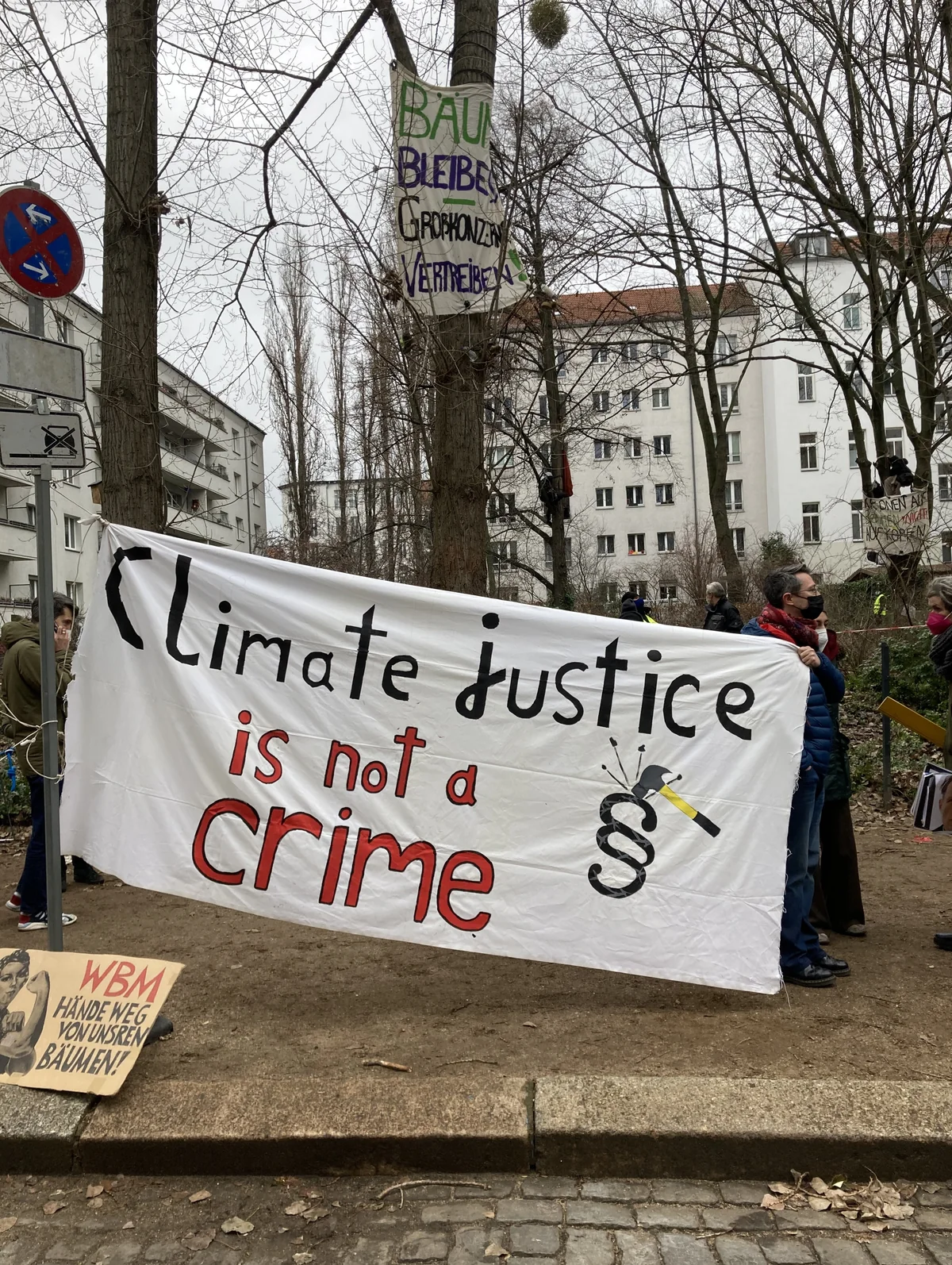 Es ist nicht das erste Mal, dass die Fällung der Bäume bevorsteht. Im November 2021 konnte die Rodung noch in letzter Sekunde verhindert werden. Am Montagmorgen sieht es anders aus: Hinter den Bauzäunen stehen um die 30 Menschen und diskutieren mit den Polizeieinsatzkräften. Viele von ihnen haben Transparente mit Aufschriften wie „Climate justice is not a crime“ in den Händen.
