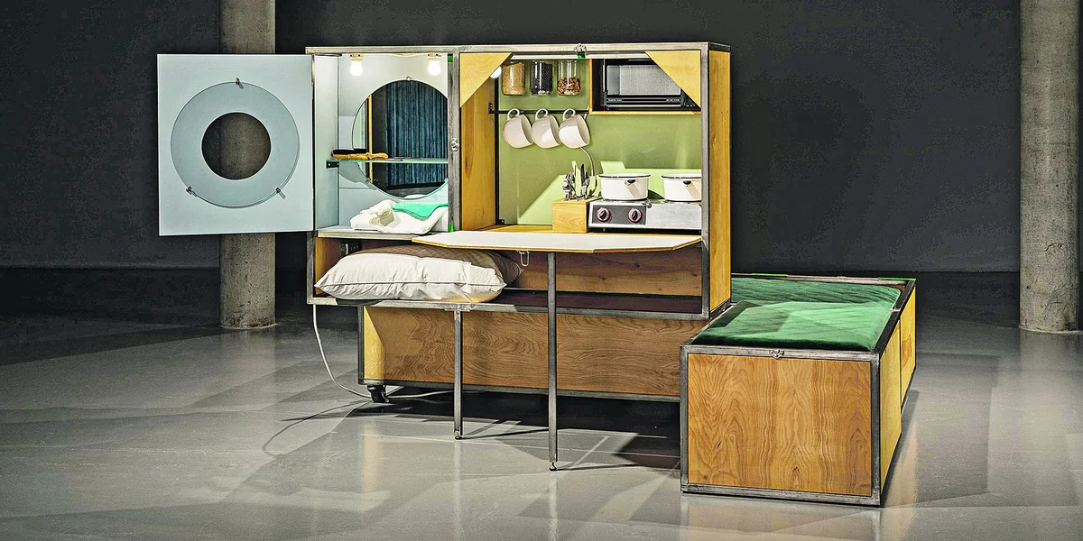 Zitiert und kritisiert wird das Bauhaus auch bei Andrea Zittel. Ihre „A-Z Living Unit“, eine kompakte Box auf Rollen, die sich zu einer kompletten Wohneinheit samt Bett und Kochnische ausklappen lässt, ist maßgeblich inspiriert von KünstlerInnen wie Margarete Schütte-Lihotzky, die mit ihrer „Frankfurter Küche“ den klassischen deutschen Küchengrundriss komprimierte und so alltägliche Laufwege verkürzte. Die Statuten von Minimalismus und Effizienzsteigerung werden in Zittels Wohnbox auf die Spitze getrieben. Platz für persönliche Besitztümer ist hier kaum, lediglich ein auf dem Nachttisch abgestellter Wecker und ein kleiner Stapel Bücher markieren den Wohnraum als belebt. Die Grenzen zwischen Mobilität und monadischem Normdasein sind, wie Zittel aufzeigt, oftmals fließend.
