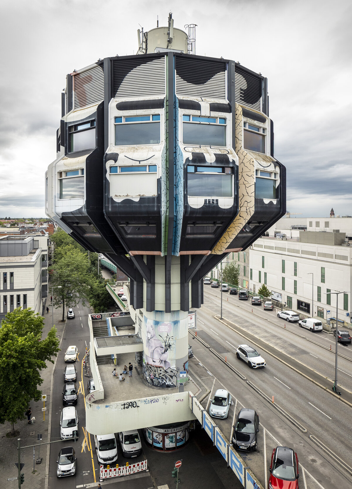 Von der Unterführung am Fuß des Pinsels führt eine schmucklose Betontreppe nach oben – und plötzlich steht man an einer Autobahn. Von der ehemaligen A104 sollte man einmal direkt in die Shoppingmall fahren können, nun endet sie wenige Hundert Meter vom Bierpinsel entfernt in der Schildhornstraße.