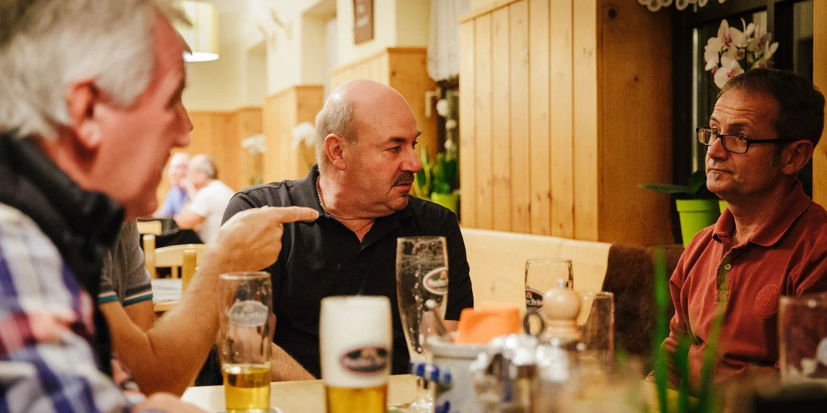 Die Männer am Tisch arbeiten als Reiseleiter, KFZ-Mechaniker, Unternehmer. Im Bräustüberl hängen Geweihe an der Wand, ein Kruzifix in der Ecke und die Wirtin bringt das Telefon an den Tisch, wenn eine Ehefrau anruft.