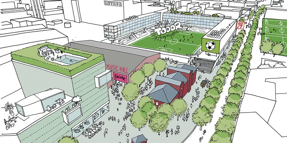 Direkt neben dem neuen Stadion, für das eine konkrete Planung noch nicht vorliegt, soll eine neue Konzerthalle für 5.000 BesucherInnen entstehen – ein Konzept, das wie eine Miniatur-Ausgabe der beiden Volksparkarenen daherkommt. Auf der anderen Stadionseite ist eine fünf- bis sechsgeschossige Wohnbebauung geplant.