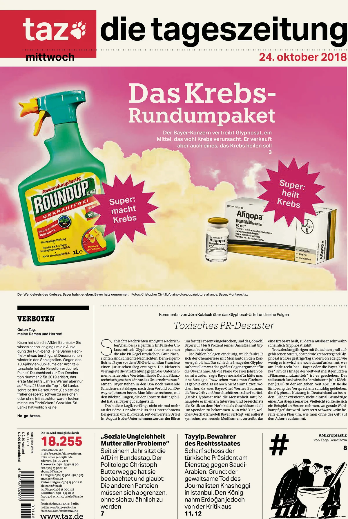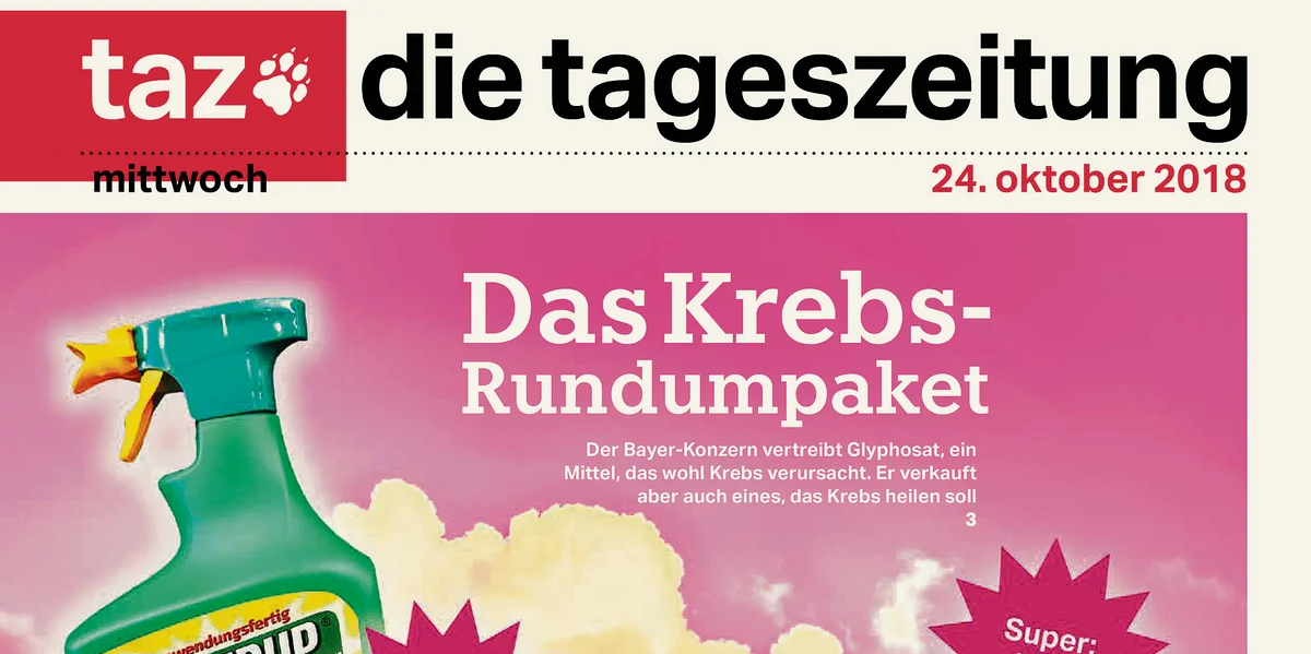 Titelseiten der taz sind bekannt für ihren Humor. Am 24. Oktober 2018 zum Beispiel druckte die Zeitung eine Persiflage auf Pharmaanzeigen. Vor einem grellen rosa Hintergrund prangte die Schlagzeile „Das Krebs-Rundumpaket“. Der Untertitel pries eine Recherche auf der Seite 3 an: „Der Bayer-Konzern vertreibt Glyphosat, ein Mittel, das wohl Krebs verursacht. Er verkauft aber auch eines, das Krebs heilen soll“.