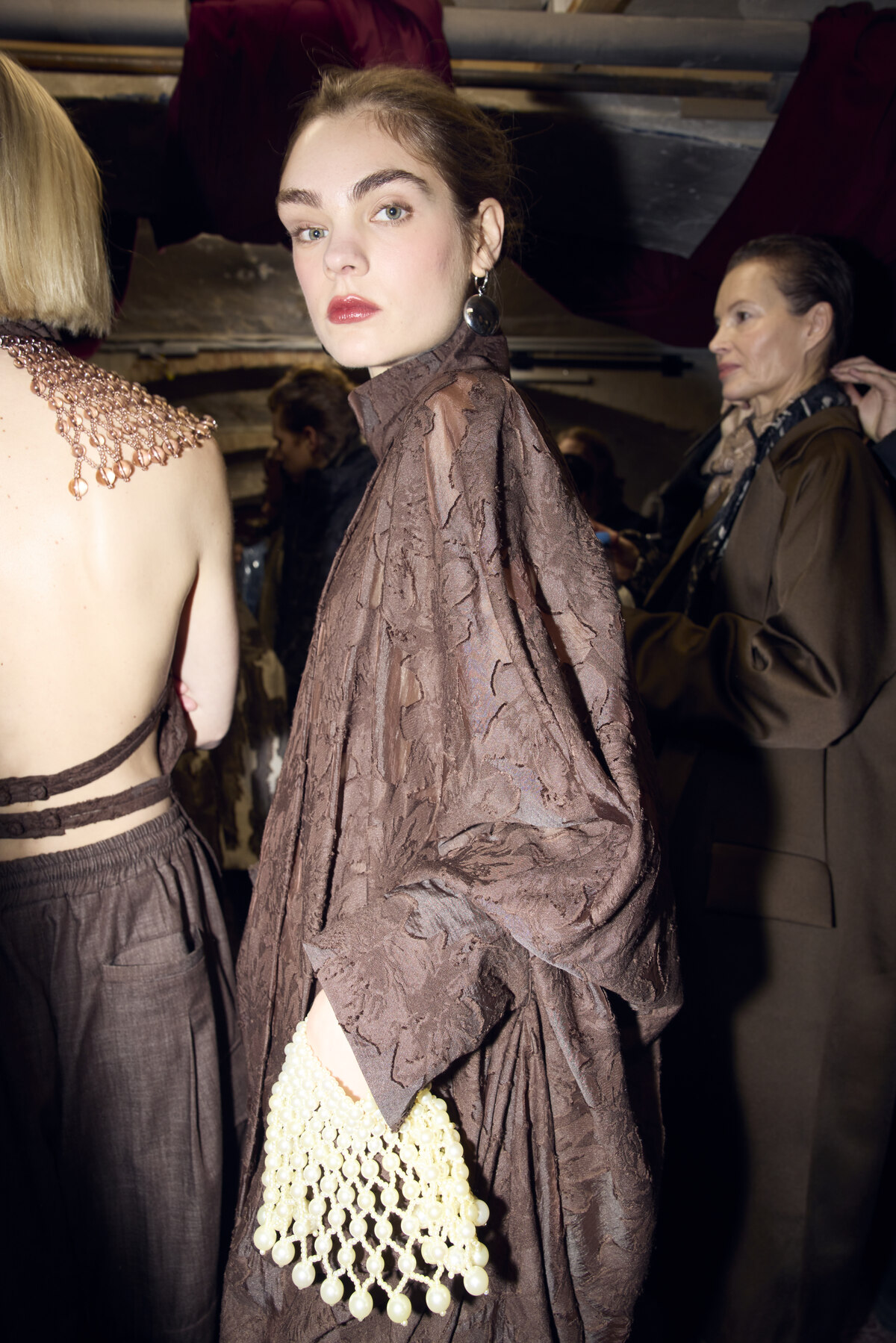 Wer schon einmal da war, konnte erkennen, dass die Kulisse, die Fan für die Show im KW Institute for Contemporary Art aufgebaut hatte, Elemente von dessen Interieur imitierte. Die Looks wiederum seien – so hieß es – von seinen Kund:innen inspiriert. Diese haben offenbar eine Vorliebe für Brauntöne, für Samt, Cord und Brokat, für schimmernde Techstoffe und barock anmutende Perlenkrägen und natürlich das Fan-typische Layering.