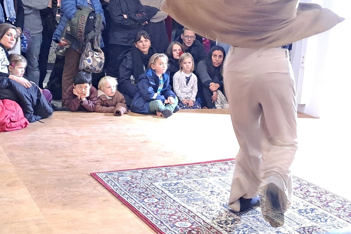 Auf der ersten Etage liegen viele Schuhe in Kindergröße vor der Tür, hinter der Ahmed einen Workshop für Afro-Contemporary gibt. Eltern drücken sich die Nasen platt am schmalen Fenster in der Tür. Dann geht es noch eine Treppe weiter in den großen Saal, wo Future Move die Performance „Ausschwärmen“ aufführt.