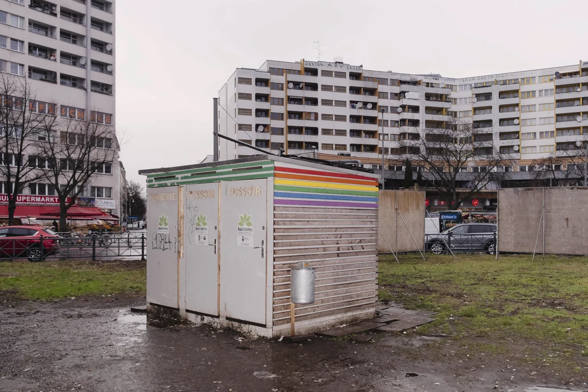 Es ist die einzige öffentliche Toilette am Kotti und dient in erster Linie als Konsumraum. Die Bretterbude mit drei Kabinen, an deren Außenseite Holzleisten in Regenbogenfarben angebracht sind, steht direkt neben der U-Bahn-Trasse auf der Mittelinsel des Kreisverkehrs.