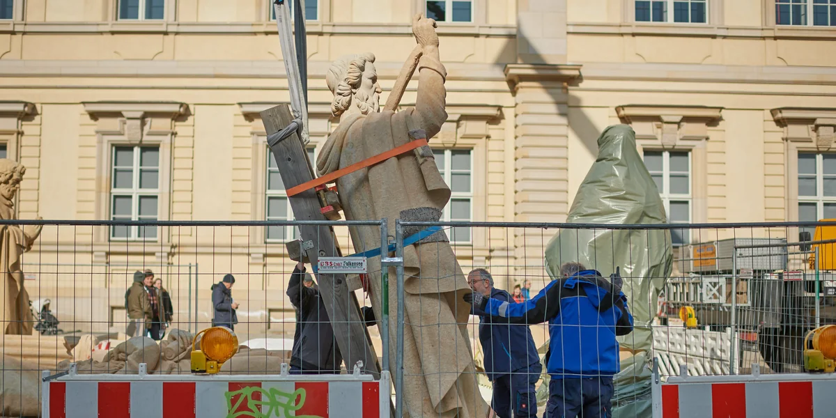 An der Balustrade der Schlossattrappe werden acht große Statuen nach historischem Vorbild montiert. Auch hierfür sollen rechte Kreise gespendet haben.