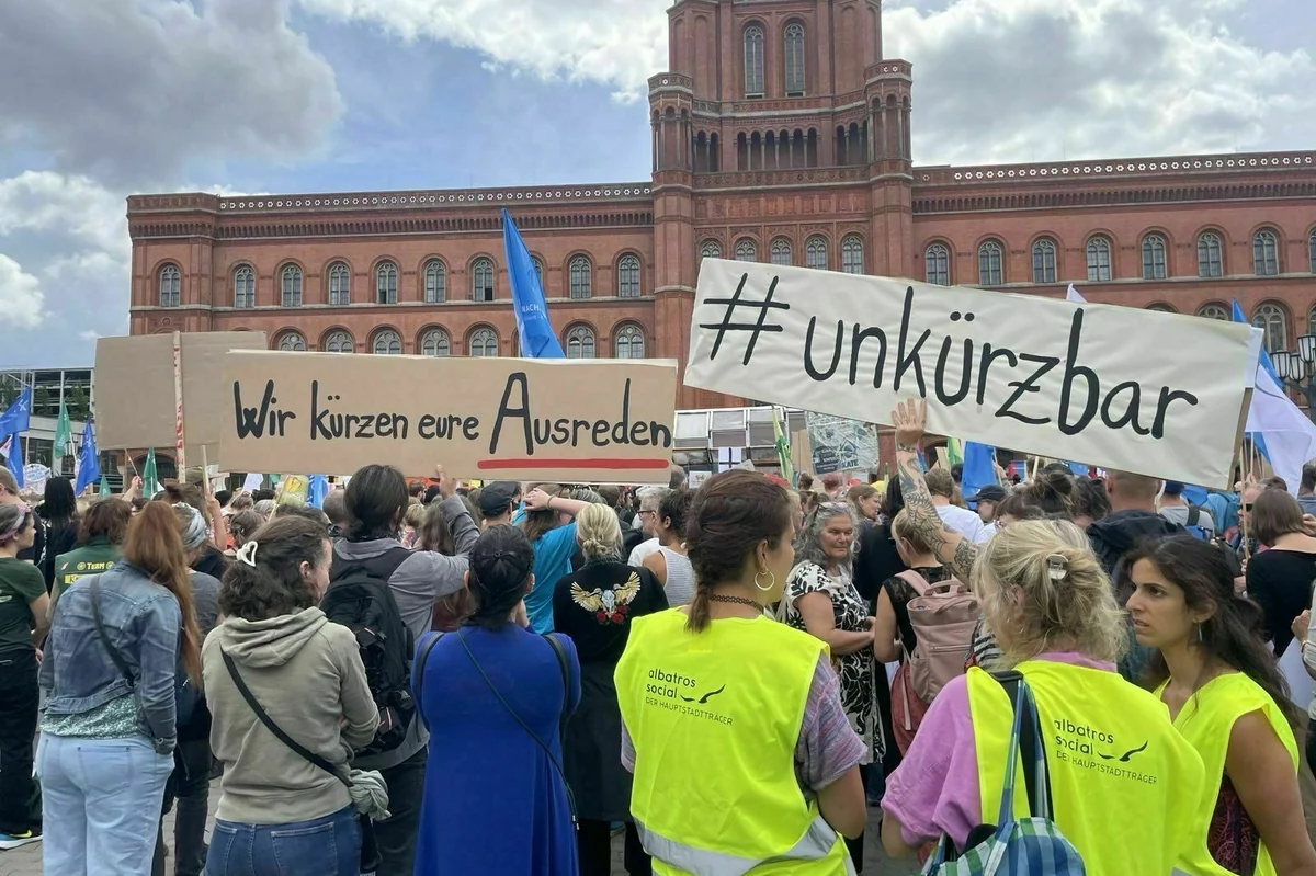 Vor diesem Hintergrund hat das Bündnis Soziales Berlin zu der Kundgebung aufgerufen. Zahlreiche Vereine aus dem Bereich der sozialen Arbeit sind dem Aufruf gefolgt. Sie beklagen vor allem Planungsunsicherheit. Der dabei auch vertretene Paritätische Wohlfahrtsverband wird später eine Zahl von 1.500 Teilnehmern nennen.