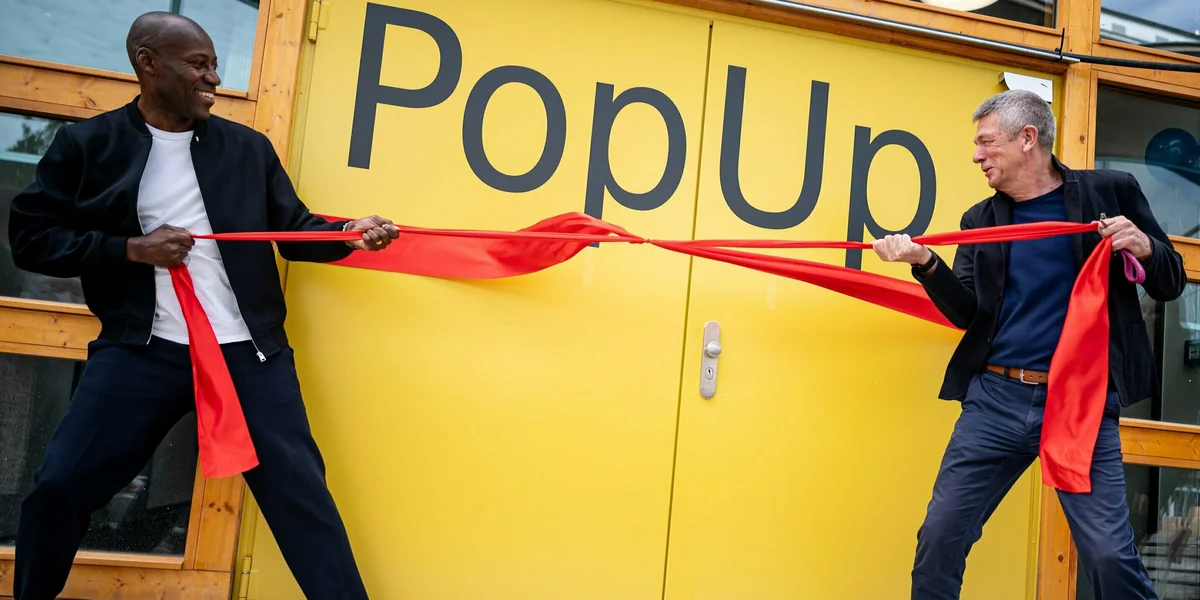 Die große Eröffnungsschleife am neuen Ergänzungsbau der Amerika-Gedenkbibliothek in Kreuzberg will nicht so recht am Sonntagmittag. Berlins Kultursenator Joe Chialo (CDU) zieht an dem einen Ende, der Generaldirektor der Zentral- und Landesbibliothek Volker Heller am anderen. Allein, die Schleife löst sich nicht, sondern verknotet sich nur. Chialo und Heller müssen recht brachial zerren, erst dann ist der rote Stofffetzen weg – und der „PopUp“ genannte Modulbau offiziell eröffnet.