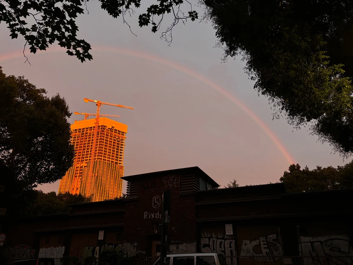 Vor ein paar Wochen, die magische Marke war noch nicht erreicht, trat der Autor dieser Zeilen abends vor seine Neuköllner Haustür und wurde von einem Bild unerwarteter urbaner Schönheit überwältigt: In die letzte Abendsonne über den dunkelnden Rixdorfer Straßen erhob sich ein orange glühender Monolith, der – als wäre das noch nicht genug – von einem blassen Regenbogen umkränzt wurde.