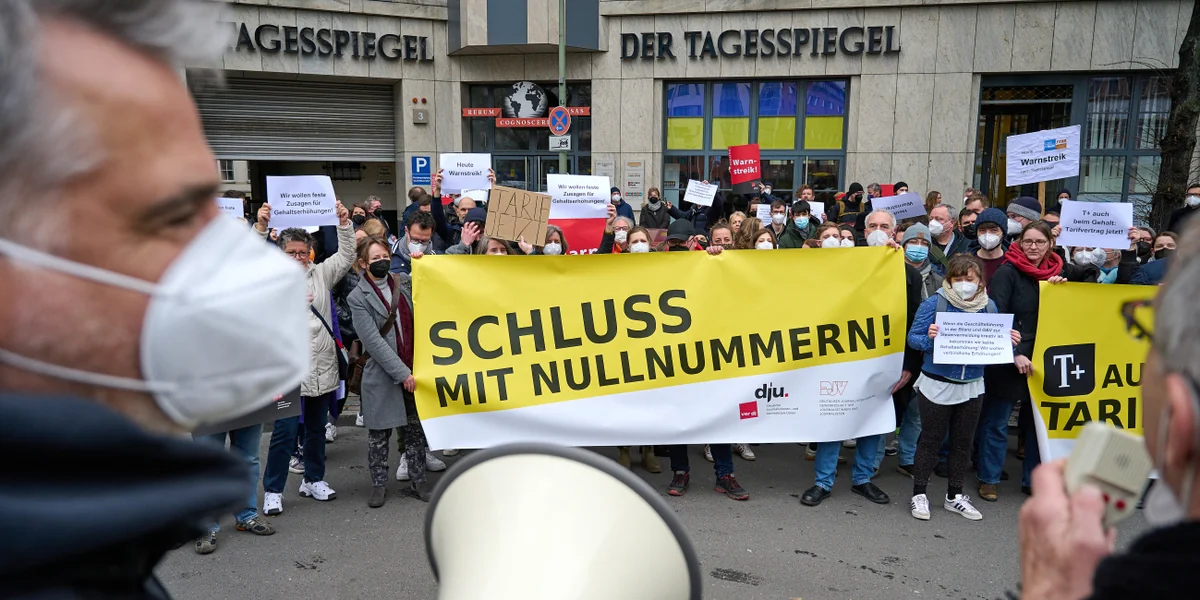 Eine Strategie, um einen Tarifvertrag zu vermeiden, findet der Großteil der Beschäftigten. „Leere Versprechen“, meint auch der Geschäftsführer der Deutschen- Journalist:innen-Union (DJU) in Verdi, Jörg Reichel. Zusammen mit dem Deutschen Journalisten-Verband (DJV) Berlin hatte seine Gewerkschaft zu einem eintägigen Warnstreik aufgerufen. „Die Lohnerhöhung würde nur 150 der 520 Beschäftigte betreffen“, sagt er.