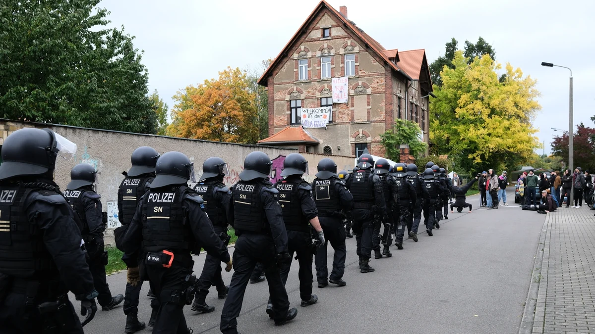 M it einer Ramme marschieren die Polizist:innen los. Helme auf, Visiere unten. Mehrere Dutzend räumen an einem Sonntag im Oktober eine Villa in Leipzig. Seit dem Morgen haben Aktivist:innen das Haus besetzt. Dunkle Vollmontur, Brechstangen, durchsichtige Schutzschilde aus Kunststoff. Schritt für Schritt nähern sie sich dem Gebäude.