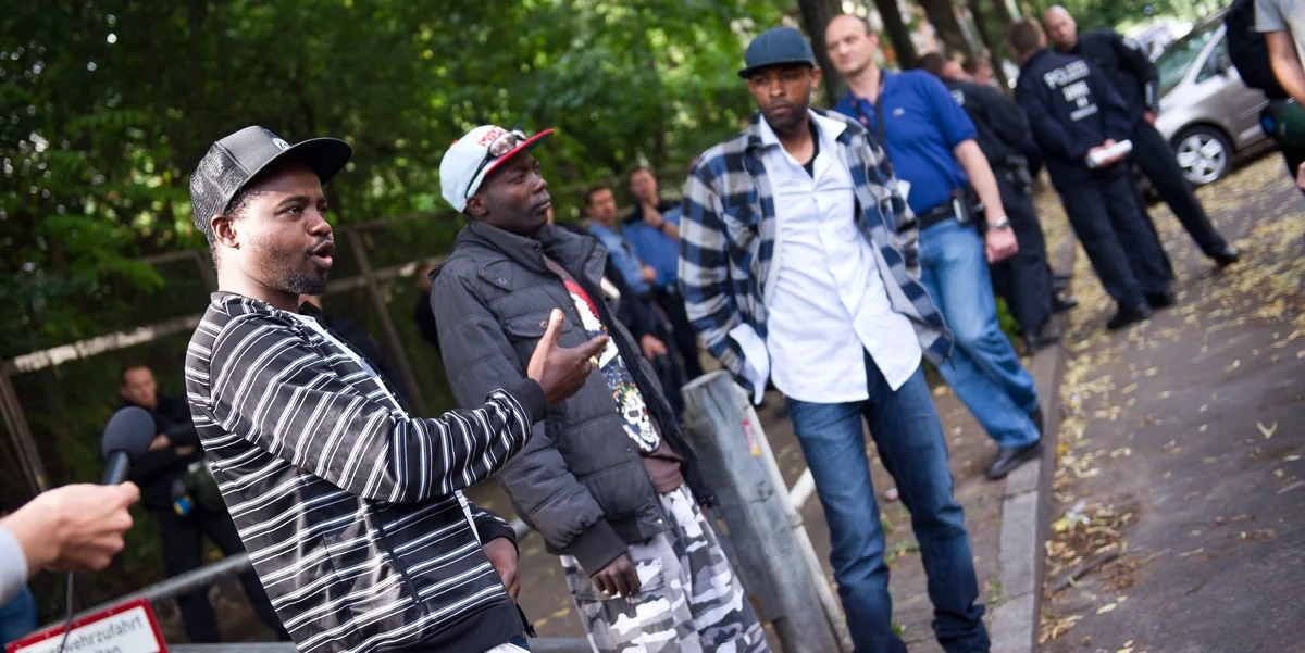 Erstmals sei drei Tagen konnten drei ihrer Vertreter wieder persönlich mit den Medien sprechen. Auf einer improvisierten Pressekonferenz vor den Toren der Schule begründeten am frühen Freitagabend aus dem Sudan stammende Flüchtlinge, warum sie nicht in der Kirche mit Krömer sprechen wollen. „Das ist kein Angebot“, sagte Adam. Bei allen dreien ist der Asylantrag abgelehnt worden. „Wir haben nichts mehr zu verlieren“, sagten sie. Und fügten hinzu: „Wenn die Schule geräumt wird, springen wir vom Dach.“ Stadtrat Hans Panhoff (Grüne) war ebenfalls anwesend. Er sagte: „Solange die Maximalforderungen der Flüchtlinge bleiben, wüsste ich nicht, was der Bezirk tun kann.“
