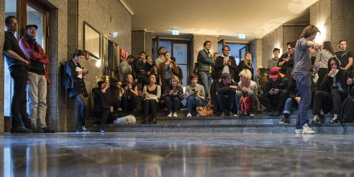 Es beginnt eine heftige Debatte. Soll man die reinlassen? Soll man ihnen zuhören? Gar mit ihnen diskutieren? Unter Zeitdruck? Immer wieder fliegen Hände in die Luft um Zustimmung zu symbolisieren. Immer wieder ruft ein Typ: „Bullshit“. Um viertel vor zwölf ist es soweit, es wird abgestimmt. Die große Mehrheit im Plenum ist für ein Gespräch.