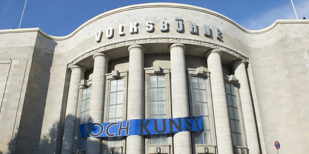 Seit Freitag säumt ein blaues Banner den Eingang der Berliner Volksbühne. „Doch Kunst“, steht darauf geschrieben. Angebracht hat es ein etwa 50-köpfiges Künstlerkollektiv, das sich „Staub zu Glitzer“ nennt – und das die Volksbühne seither besetzt hält. Mit einer „kollektiven, transmedialen und mimetischen Theaterinszenierung“ nehme man das Haus in Besitz, erklärt eine Sprecherin am Abend unter Applaus.