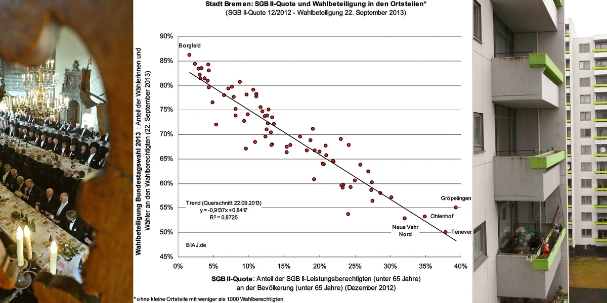 Wer arm ist, geht seltener wählen. Das ist keine ganz neue Erkenntnis, aber ein Trend, der sich zunehmend verfestigt. In Borgfeld, wo es fast keine Hartz-IV-EmpfängerInnen gibt, war die Wahlbeteiligung am Sonntag mit 86,2 Prozent am größten. Und in Tenever, wo mehr als jeder Dritte von staatlichen Transferleistungen lebt, geht nur jeder Zweite wählen. Ähnlich sieht es im Ohlenhof, der Neuen Vahr Nord oder Gröpelingen aus.