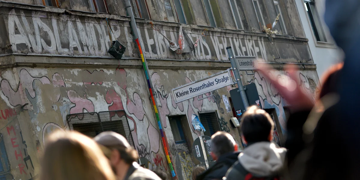 W as wäre Berlin ohne linke Freiräume? Vermutlich kaum mehr als nur eine weitere durchgentrifizierte, gesichtslose Metropole. Besonders deutlich wird das in Mitte, rund um den Rosenthaler Platz: gläserne Fassaden säumen die Straßen, Touris und Digitalarbeitende füllen sie, strömen umher zwischen teuren Restaurants und Klamottenläden, hippen Cafés und Start-up-Co-Workingspaces.