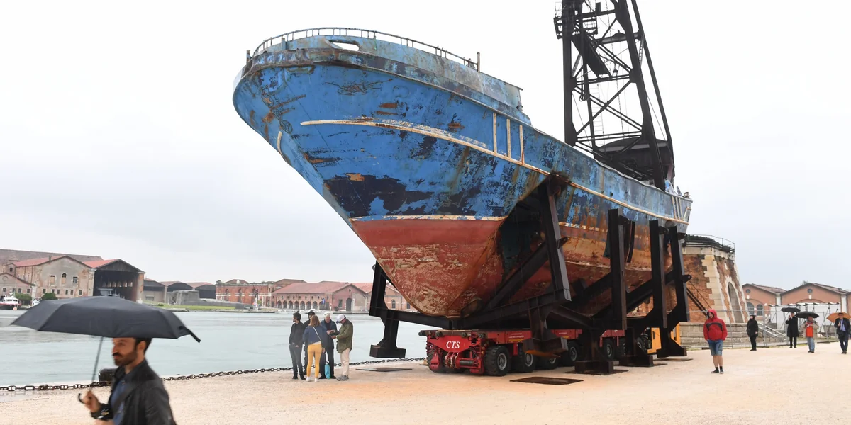 Der Schweizer Künstler Christoph Büchel, zuletzt wegen seiner Online-Petition im Gespräch, mit der er acht Prototypen der Mauer, die US-Präsident Donald Trump an der Grenze zu Mexiko aufbauen will, zu nationalen Denkmalen erklären wollte, hat das Boot von Sizilien aus auf die Reise nach Venedig geschickt.
