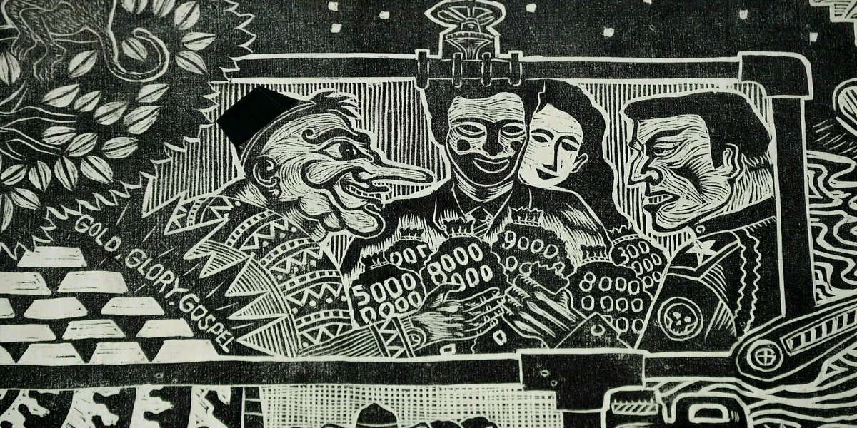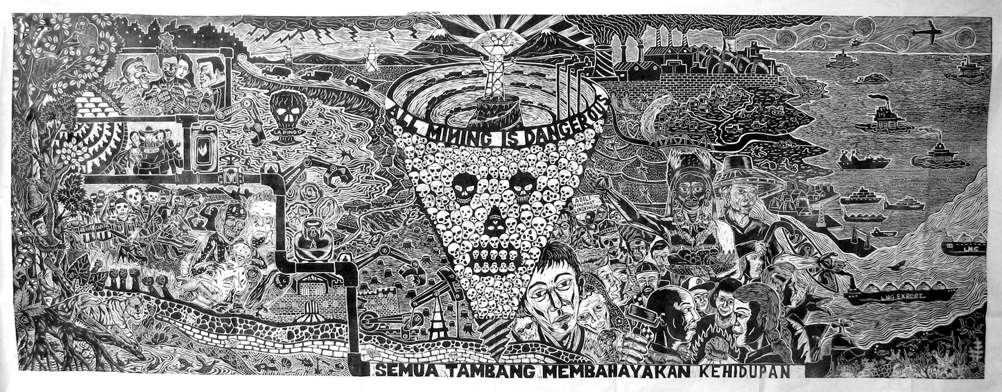 Gemäß Erklärung der documenta kritisiere „All Mining is Dangerous“ das Bergbausystem in den USA und in Indonesien. Der Holzschnitt zeigt auch vier Personen, die große Mengen Geld in Form von Geldsäcken unter sich aufteilen. Eine davon hat eine lange Nase, ihre wulstigen Lippen ziehen ein hämisches Grinsen. Sie trägt eine Kopfbedeckung, die nun mit einem schwarzen Stück Klebeband überklebt wurde.