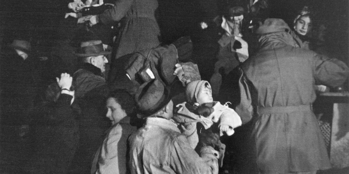 Zu sehen ist eine nächtliche Szene. Erwachsene und Kinder verlassen oder besteigen ein Fahrzeug, so genau ist das nicht zu erkennen. Manche Erwachsene haben Babys im Arm. Es muss recht kühl sein, denn die Erwachsenen tragen Mäntel, die Männer zudem einen Hut. Links oben sieht man ein Kind mit seinem Teddybären. Am unteren Bildrand ist ein Mann erkennbar, der ein Kleinkind hochhebt, links von ihm steht eine Frau, deren Profil deutlich erkennbar ist.