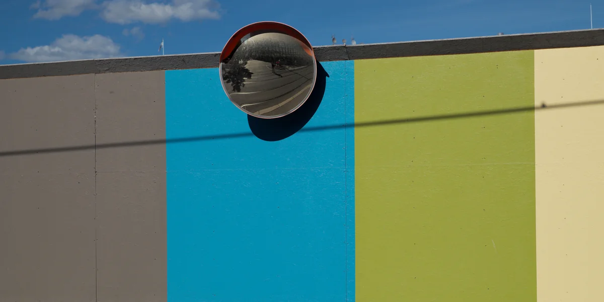 Stattdessen fotografiert Godow eine profan wirkende und menschenleere Tramhaltestelle. Auf dem Bild scheint die Sonne durch farbiges Acrylglas und taucht die Szenerie so in futuristisch-leuchtendes Orange. Dahinter ist, etwas verborgen, eine Absperrung erkennbar – das Relikt einer Baustelle? Ein neues Bauprojekt?